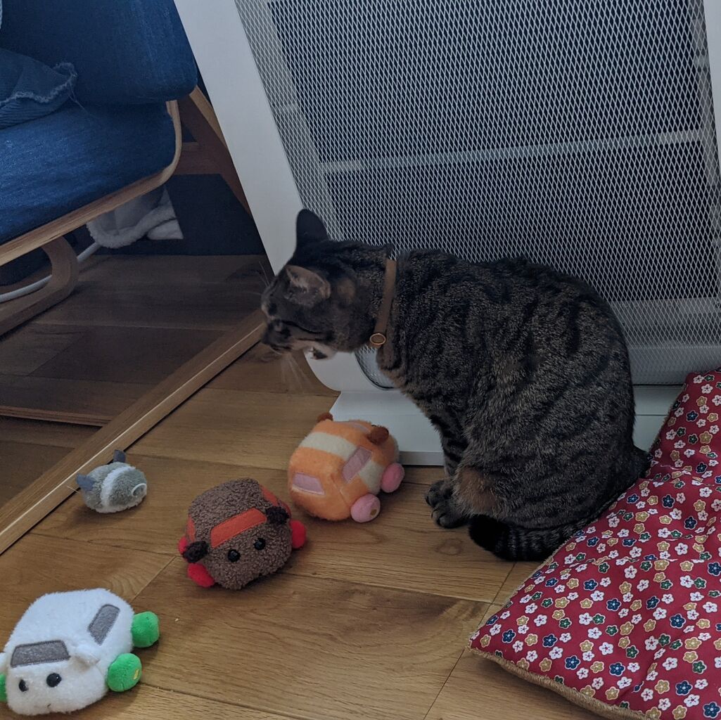 モルカー(娘に配置された)と共にぬくまるトラちゃん。