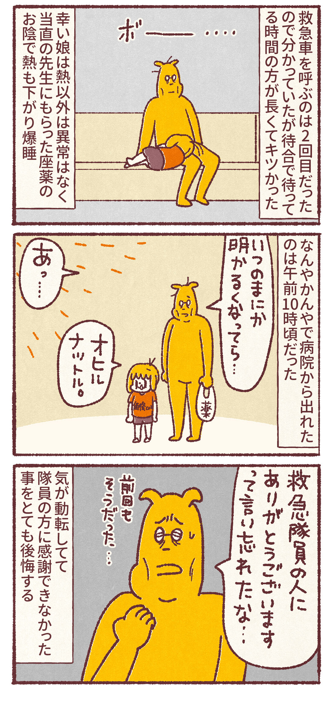 前回も今回も気が動転してたので救急隊員の人にありがとうが言えなかったな…