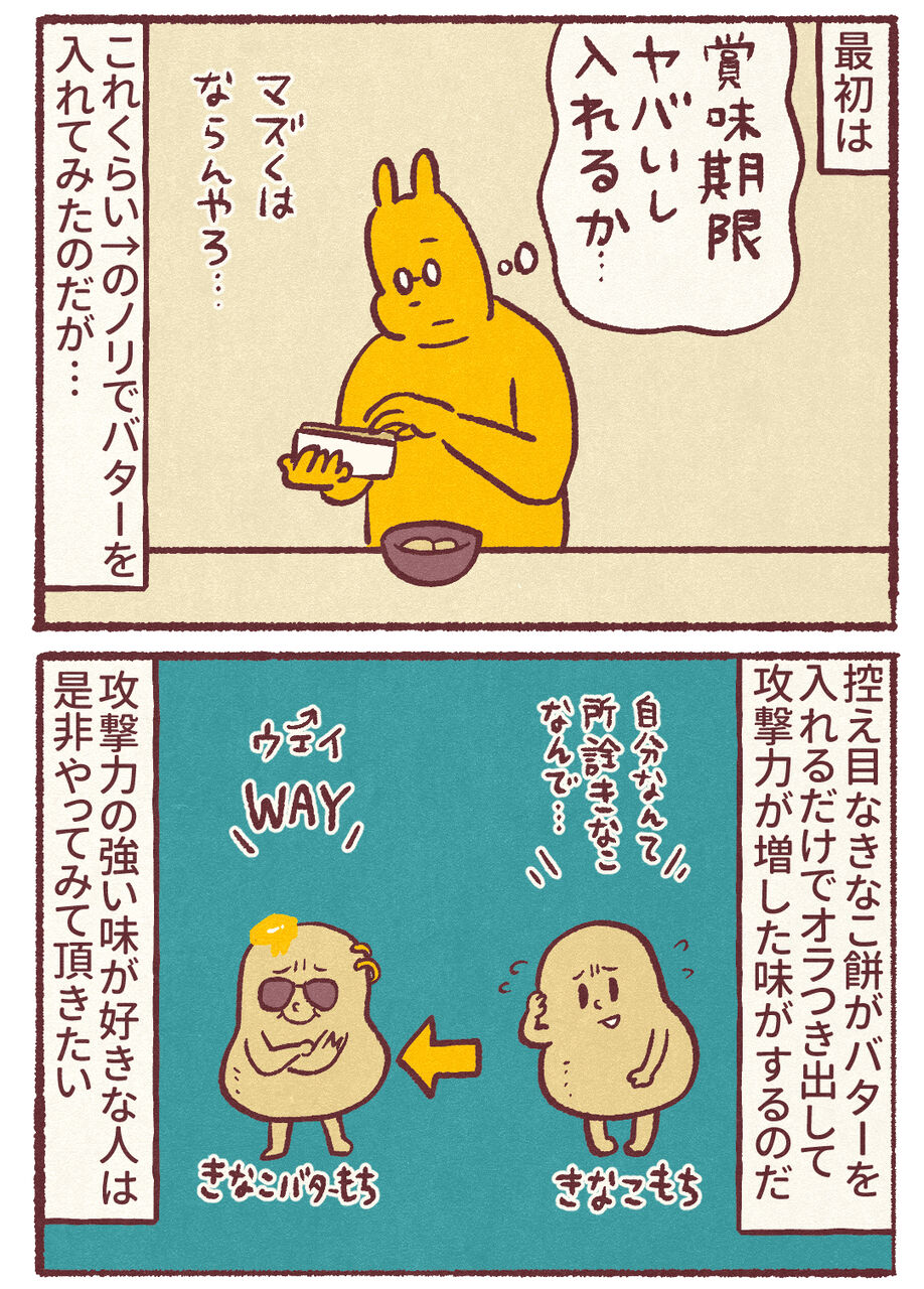 2025年01月09日 高カロリー餅にハマってしまった正月 人間も餅もちょっとしたきっかけで変わるもんだねぇ〜多分私程度の人間がやり出した事なので既に他の人もやってるかもしれませんがきなこバター餅の暴力性のある旨さにはちょっと感動しましたわ。▼ブログ村ランキングに参加してます ▼最新のブログ更新情報が届きます!▼LINEスタンプ▼ココナラ▼スズリ 「思いつき」カテゴリの最新記事