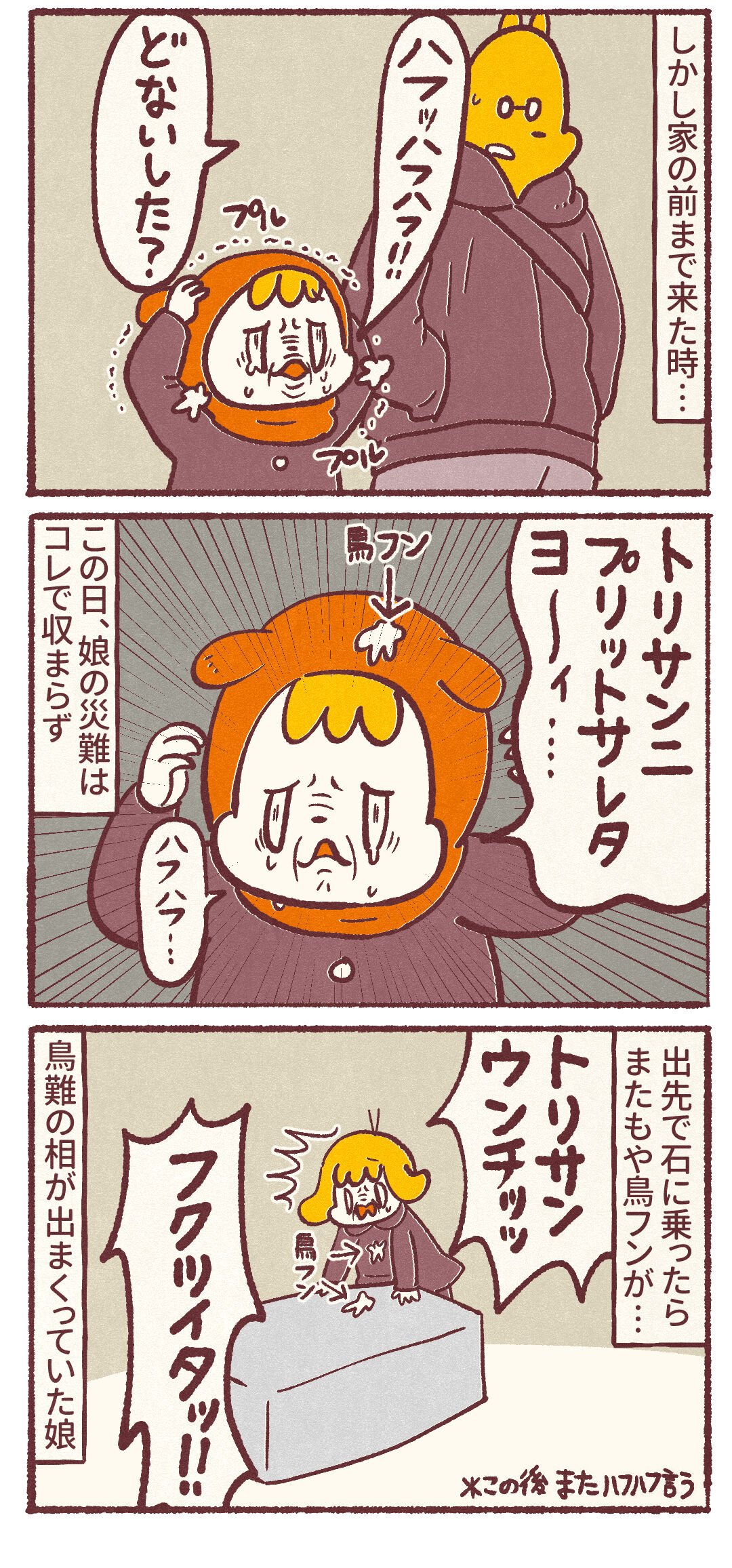 2025年03月04日 鳥難の相がでてた娘 一日に鳥フン2回も付くなんてな…娘は野鳥観察の為に双眼鏡持って出かけるレベルの鳥好きなのに鳥運はあんまりないんですよね以前も外でご飯食べてたら鳥に囲まれてパニックになってたし… 反対に私は今まで鳥フン落とされた事も服についちゃったりも経験ないんですよね。基本的に外歩く時は鳥居そうな地点は避けて通るのがポイントです▼ブログ村ランキングに参加してます ▼最新のブログ更新情報が届きます!▼LINEスタンプ▼ココナラ▼スズリ 「娘」カテゴリの最新記事