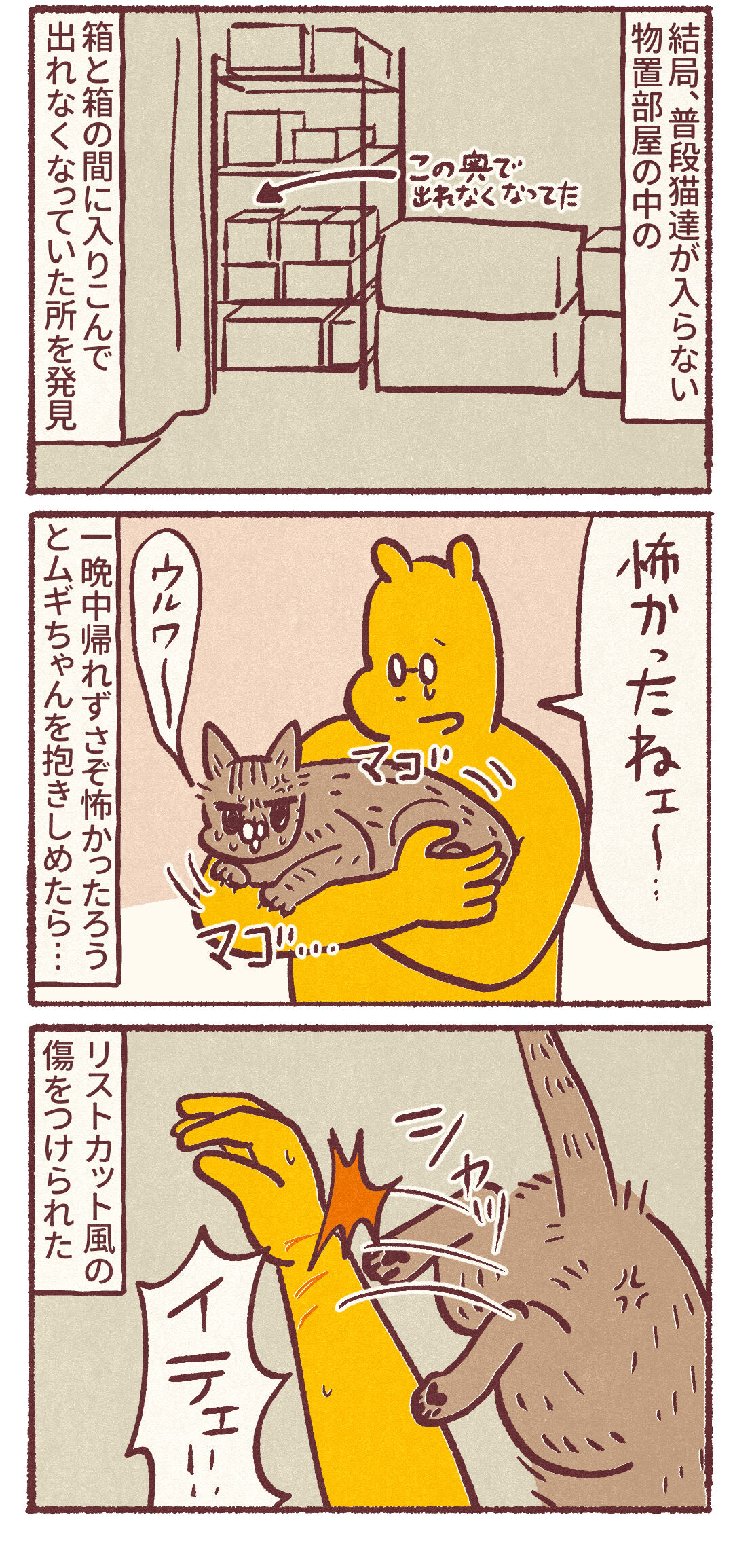 箱と箱の間にテトリス型にムギちゃんが挟まってまして…